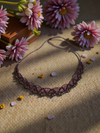 El Macramé ofrece una textura suave y cómoda al tacto. Esta elección de materiales asegura que el collar sea ligero y agradable de llevar, incluso durante largas jornadas.